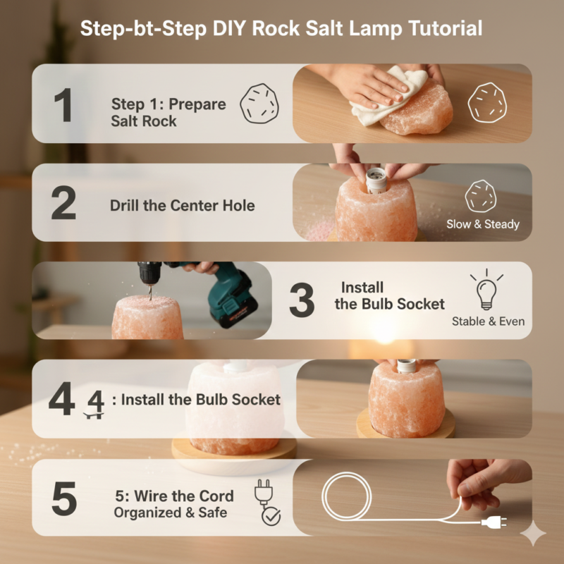 Begin by preparing the salt rock. Choose a stable rock salt piece and wipe off loose dust. When drilling the center hole, work slowly and keep the drill straight so the opening fits the socket. Next, install the bulb socket by placing it firmly into the drilled space. After that, secure the base using screws or adhesive so the lamp stays steady. Finish by wiring the cord according to the socket kit instructions. Step-by-step pictures for each stage help show hand placement, depth, and positioning, making the process easier to follow for beginners.