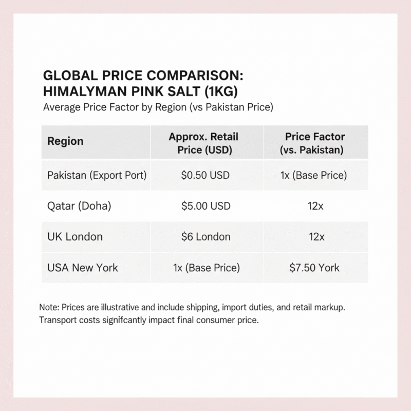 The price of Himalayan salt is dramatically different because the raw cost in Pakistan includes only mining and basic cutting, while the price in the USA, UK, or Qatar includes expensive international shipping, import duties, and multiple company profits. The farther the salt travels from the mine, the higher the himalayan salt price gets for the customer.