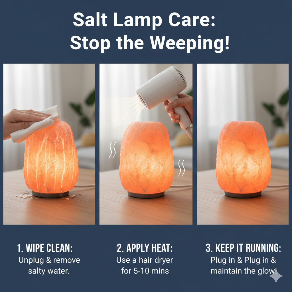 Think of your salt lamp as a sponge. When your room is very wet (high humidity), the sponge quickly soaks up that moisture. If the sponge gets too full, the water drips out. That’s the salty water you see on your nightstand.