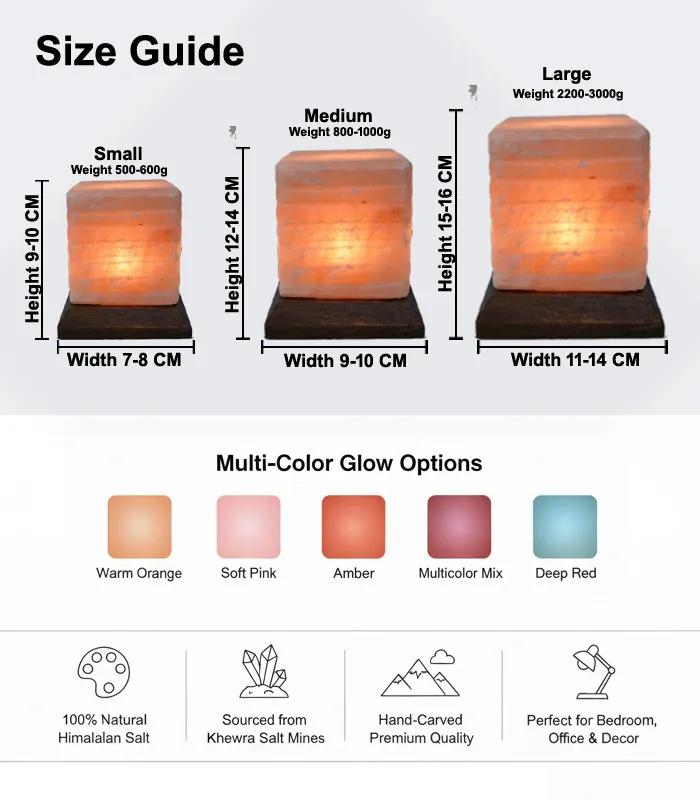 Elegant Brick/Cube-Shaped Himalayan Salt Lamp carved from real Khewra pink salt. Comes with RGB multi-color changing LED and a USB/USA cable that works with any mobile charger. Perfect for décor, wellness, and gifting.