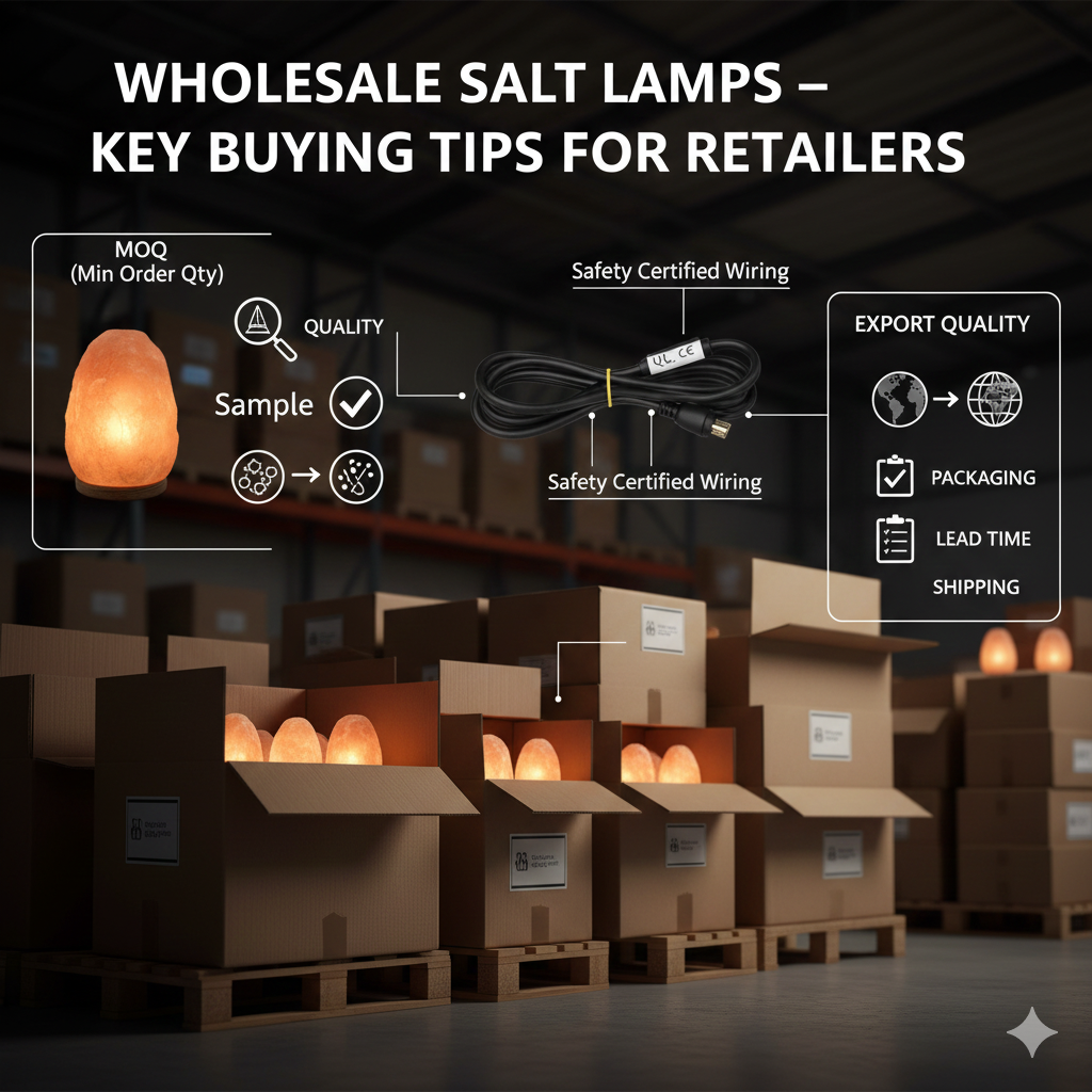 Choosing the right wholesale salt lamp supplier starts with confirming genuine Khewra origin, since real lamps come from this specific Himalayan region. Always ask for lab test reports that show mineral composition and verify that the product meets export standards. A good supplier will also provide UL or CE-certified cords, especially for US and EU shipments. Request clear product photos, packaging samples, and batch details to check consistency. Reliable exporters share traceability information, respond quickly, and openly explain their production process, helping retailers avoid fake or low-grade salt lamps.